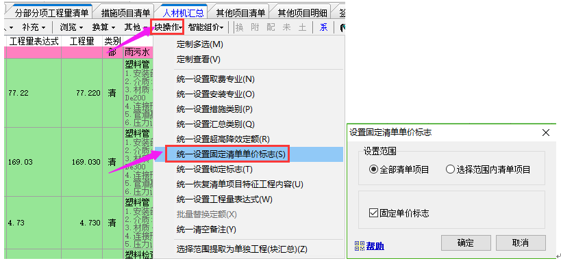 如果清單全部要固定:需按上面操作完之后,再點(diǎn)擊塊操作下的統(tǒng)一設(shè)置固定清單單價(jià)標(biāo)志功能。