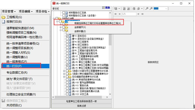 答:(1)項(xiàng)目工程中,點(diǎn)擊“項(xiàng)目管理”下拉選擇“統(tǒng)一打印”功能,進(jìn)入報(bào)表打印界面。如下圖所示: