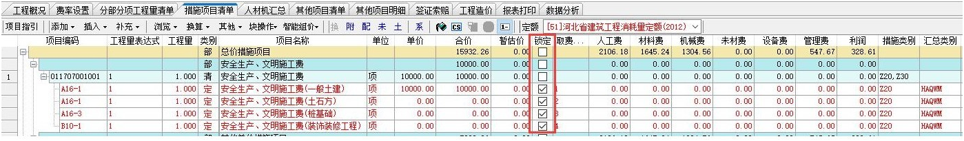 如果不希望文檔屬性或者費(fèi)率重置的時(shí)候會(huì)將固定好的安全文明施工費(fèi)再重置,則需要將所有的分專(zhuān)業(yè)的安全文明施工費(fèi)的定額行都固定。如下截圖: