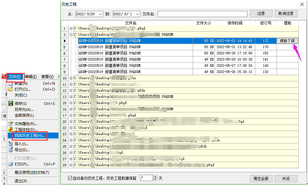 答:軟件提供找回歷史工程的功能,默認(rèn)是保留七天以?xún)?nèi)的工程數(shù)據(jù)的。 點(diǎn)擊菜單欄文件下的找回歷史工程,在彈出的窗口找到對(duì)應(yīng)工程點(diǎn)開(kāi)加號(hào),對(duì)照保存時(shí)間列找到相應(yīng)時(shí)間點(diǎn)的工程,提取工程數(shù)據(jù)即可。如下所示: