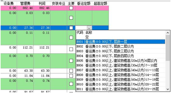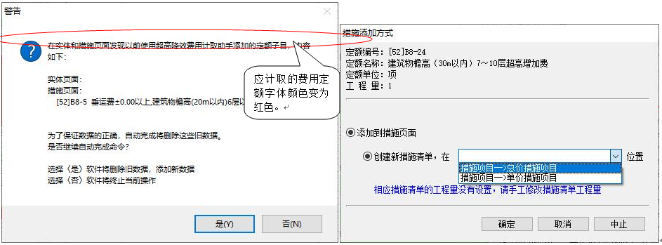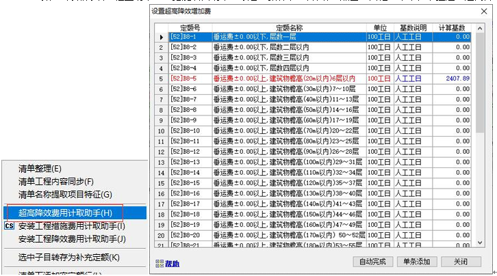 3)、執(zhí)行該命令,彈出如下窗口,應(yīng)計(jì)取的超高及垂運(yùn)費(fèi)用定額將變成紅色,其計(jì)取基數(shù)變成藍(lán)色。 4)、直接雙擊紅色定額行 或 點(diǎn)擊“單條添加”按鈕,可實(shí)現(xiàn)單條添加該項(xiàng)費(fèi)用定額到當(dāng)前選擇的位置。點(diǎn)擊“自動(dòng)完成”按鈕,將自動(dòng)添加當(dāng)前工程所有的“垂運(yùn)費(fèi)”和“超高費(fèi)”定額,點(diǎn)擊“自動(dòng)完成”按鈕后,點(diǎn)擊自動(dòng)完成,系統(tǒng)自動(dòng)檢測(cè)工程中是否已經(jīng)存在相關(guān)費(fèi)用定額。如已經(jīng)計(jì)取了相關(guān)費(fèi)用,會(huì)進(jìn)行提示。