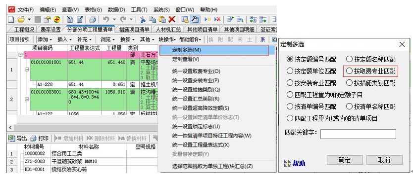 2)、選擇多條定額子目,統(tǒng)一設(shè)置“超高垂運(yùn)”標(biāo)志 (1)手動(dòng)按“Ctrl+左健”可選擇多條定額子目; (2)在“分部分項(xiàng)工程量清單”或者“預(yù)算表”界面,點(diǎn)擊“塊操作”下拉選擇“定制多選”,按取費(fèi)專(zhuān)業(yè)選擇裝飾裝修專(zhuān)業(yè)點(diǎn)擊確定(這個(gè)選擇方法會(huì)一次把裝飾定額全部選擇中)。