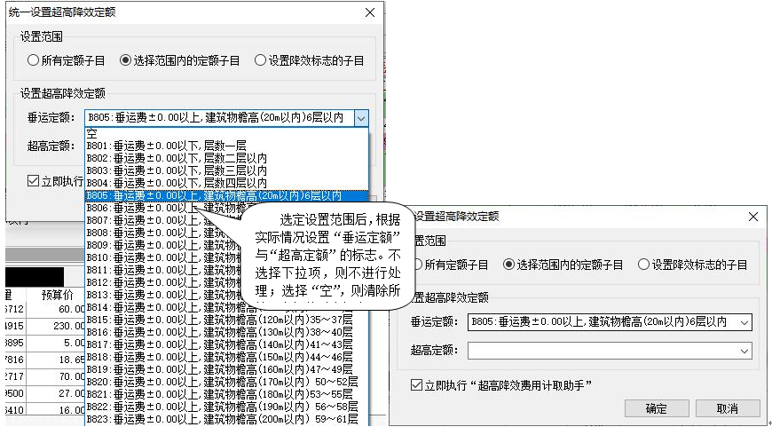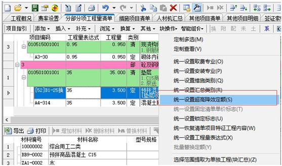 (3)通過(guò)“塊操作”下的“統(tǒng)一設(shè)置超高降效定額”功能,可對(duì)選中的定額進(jìn)行統(tǒng)一設(shè)置超高降效標(biāo)志。如下圖所示: