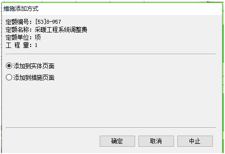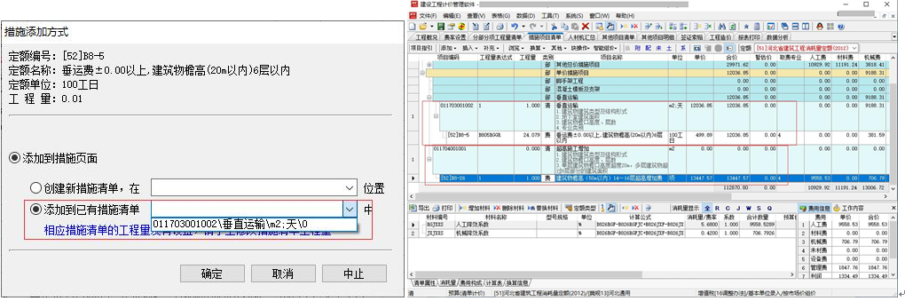6)、點(diǎn)擊“確定”按鈕,由于當(dāng)前工程為清單工程,系統(tǒng)自動(dòng)將費(fèi)用定額添加到措施頁(yè)面中對(duì)應(yīng)措施項(xiàng)目下,如下圖: