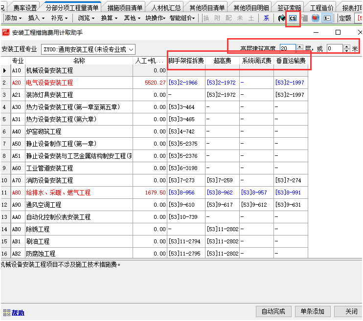 答:針對(duì)安裝專(zhuān)業(yè)的工程,咱們軟件提供了安裝工程措施費(fèi)用計(jì)取助手(也就是CS按鈕)的功能,一鍵計(jì)取安裝專(zhuān)業(yè)的超高費(fèi)、垂運(yùn)費(fèi)、腳手架搭拆費(fèi)和系統(tǒng)調(diào)試費(fèi)這四項(xiàng)費(fèi)用。 注意功能操作之前不需要特意選中定額子目,軟件會(huì)自動(dòng)識(shí)別到安裝定額庫(kù)各個(gè)分冊(cè)的子目,來(lái)自動(dòng)統(tǒng)計(jì)基數(shù),截圖如下: