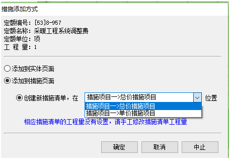 5)、執(zhí)行該命令后,出現(xiàn)措施添加方式((定額計(jì)價(jià)傳統(tǒng)模式除外))。 (1)第一種:創(chuàng)建新措施清單,可選擇添加到單價(jià)措施或總價(jià)措施。如下圖所示: (2)添加到已有措施清單,直接下拉選擇對(duì)應(yīng)清單。如下圖所示