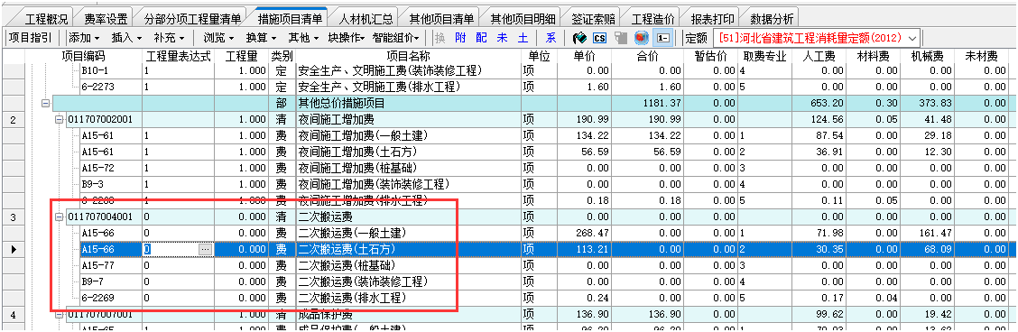 答:清單工程中在措施項(xiàng)目清單界面,根據(jù)需要可以進(jìn)行刪減。例如,二次搬運(yùn)費(fèi)不需要計(jì)取了,可以直接刪掉或者清單和定額工程量同時(shí)改0。如下截圖: