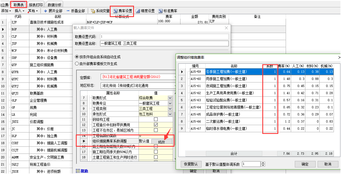 定額工程中,在取費(fèi)表界面,點(diǎn)擊費(fèi)率設(shè)置按鈕,可以通過(guò)修改組織措施費(fèi)系數(shù)來(lái)實(shí)現(xiàn)。如下截圖: