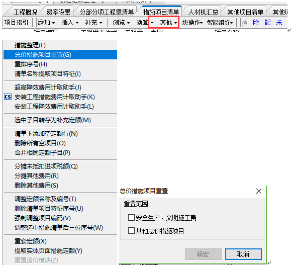 答:更新到最新版本之后,清單工程中如果安全文明或者總價(jià)措施修改了想要恢復(fù)到默認(rèn)計(jì)取的狀態(tài)??梢栽诖胧╉?xiàng)目清單界面,點(diǎn)擊其他按鈕下的總價(jià)措施項(xiàng)目重置。